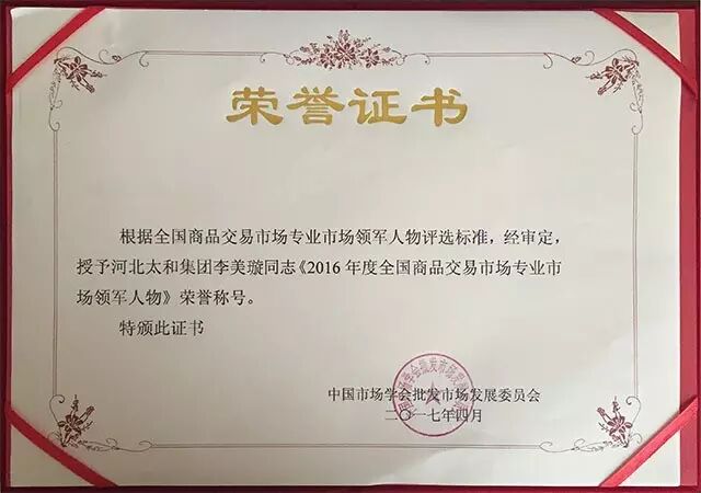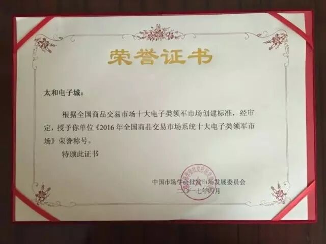 2017年4月16日,第十八屆中國商品交易市場發展論壇在京隆重舉行。本次論壇由中國市場學會主辦,中國市場學會批發市場發展委員會、中國市場學會商務策劃專業委員會協辦。太和電子城受邀參加本次論壇,同時榮獲“2016年全國商品交易市場系統十大電子類領軍市場”、太和集團總裁兼太和電子城總經理李美璇榮獲“2016年度全國商品交易市場專業市場領軍人物”榮譽稱號!