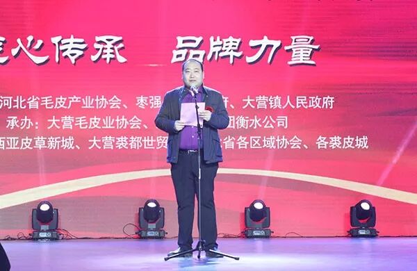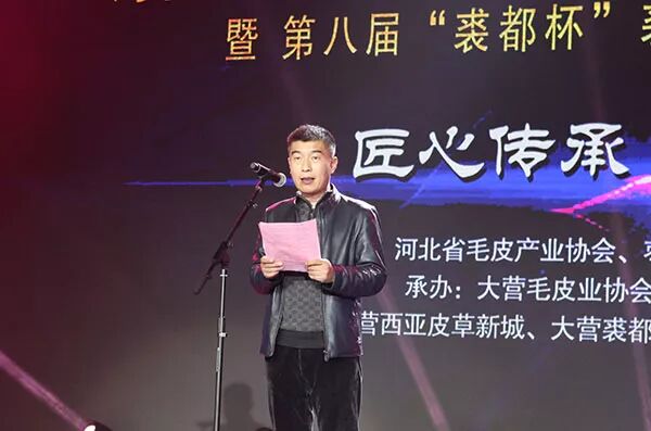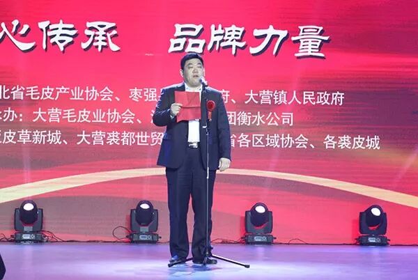 河北省毛皮產業(yè)協(xié)會執(zhí)行會長、秘書長靳國慶在大賽上宣讀關于授予中國•大營國際皮草交易中心、中國•大營國際裘皮城“河北省轉型創(chuàng)新示范市場”榮譽稱號的決定,并向河北太和集團衡水公司商業(yè)運營總經理張雨兵授牌。