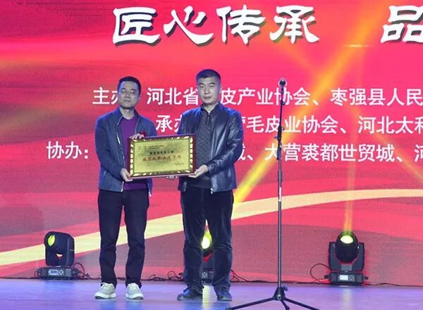 棗強縣委宣傳部副部長、棗強廣播電視臺臺長張克珍,河北省毛皮產業(yè)協(xié)會首席設計顧問張俊霞為獲得優(yōu)秀品牌企業(yè)頒獎
